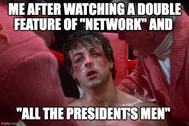 In my opinion, all three are great films for different reasons. But wow, how about a double-feature of All the President's Men and Network? You'd walk out of the theatre looking like Rocky Balboa.