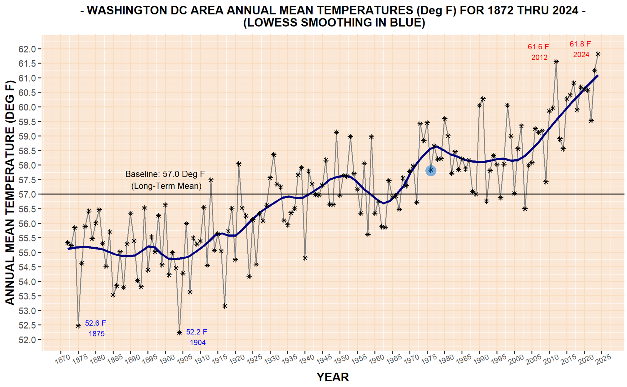 Average mean temperature has risen from 57.8º F in 1976 to 61.8º F in 2024. The trend line is from 58.5º to 61.2º, all above the baseline mean of 57ºF. So we're seeing 3-4º rise in temperature, and 6º rise from the 1870s to today.