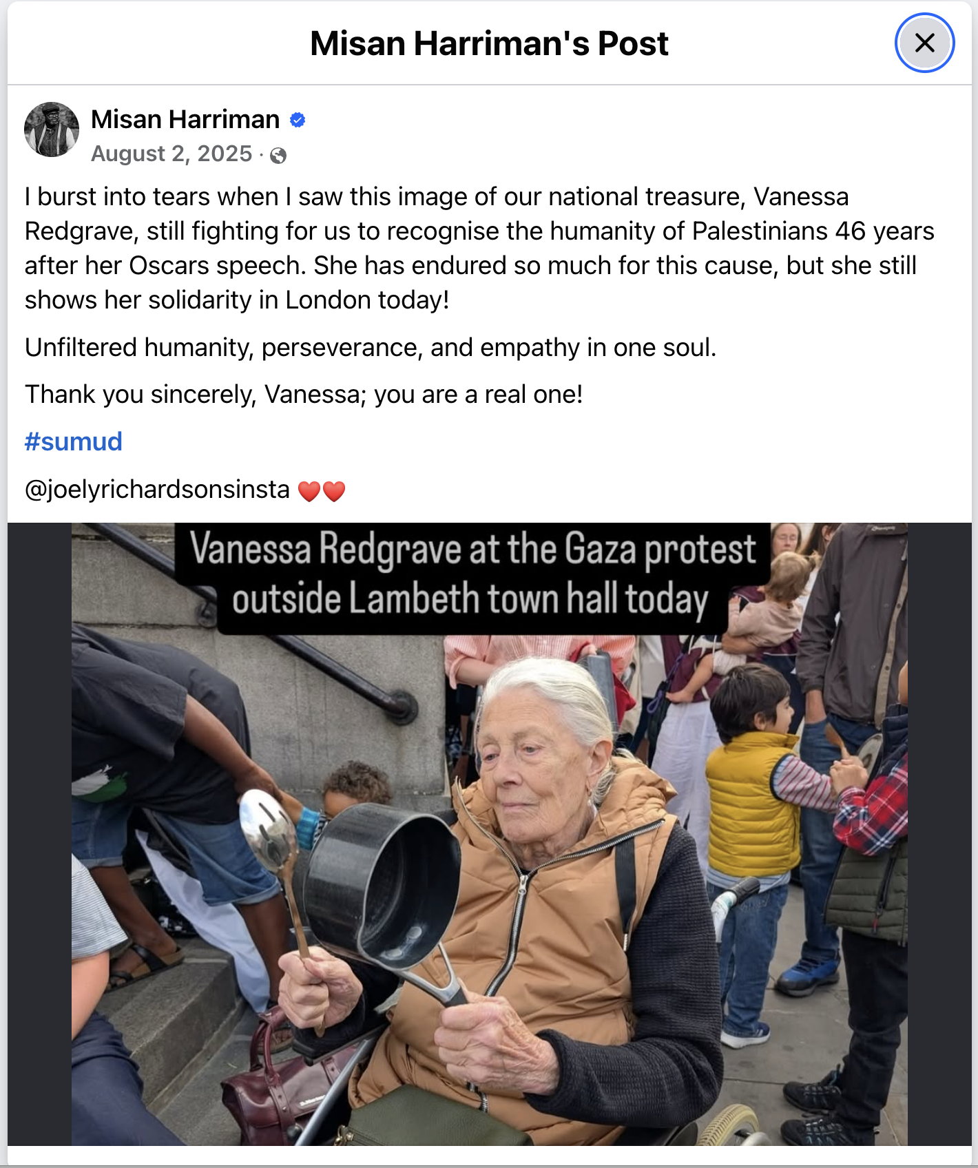 There is a distinction between the belief that Jewish people should have a homeland and the religion of a people, but it's a distinction which continues to be blurred today, sometimes for political advantage. And there are many forms of Zionism, spanning the political spectrum and it gets really complicated. So I'll stop there. Suffice it to say, I firmly believe Vanessa was and is committed to the end of oppression for everyone, for human rights in general, and this was one issue of many for her over her lifetime.