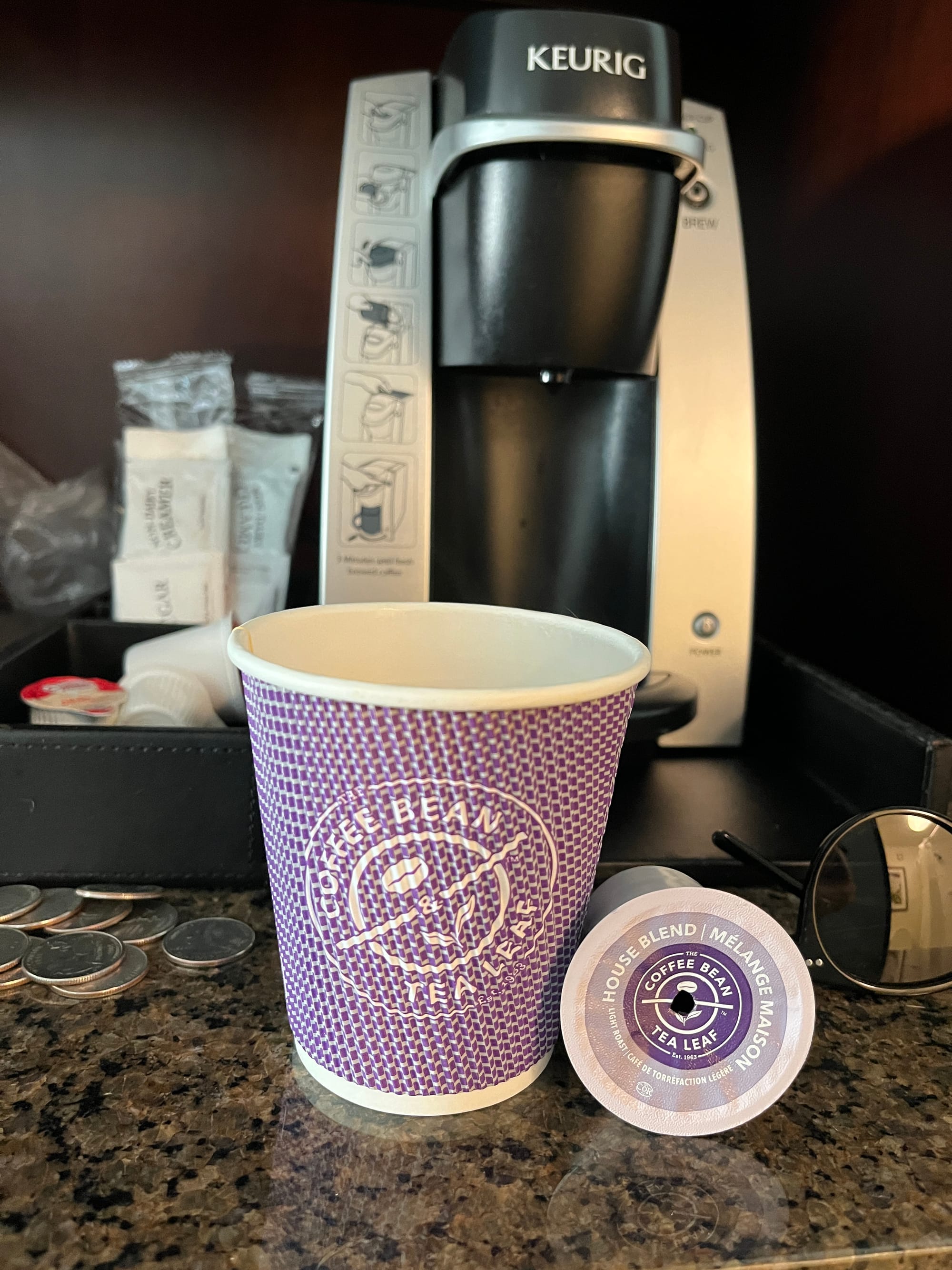 And here is the Keurig, with "pods" from The Coffee Bean and Tea Leaf. I think of my mom. She was right. So very right about hotel coffee pods and The Coffee Bean and Tea Leaf. In case the name isn't familiar to you, The Coffee Bean and Tea Leaf is a fixture in the L.A. café-scape, and they have been roasting beans and brewing fine coffee for quite some time. I've really only seen the shops in L.A. Now, by golly, they're in hotels in middle Massachusetts.